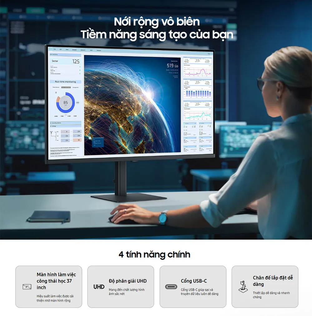 Màn hình được trang bị độ phân giải 4K (3840 x 2160) trên kích thước 37 inch, cho mật độ điểm ảnh cao, hình ảnh sắc nét và chi tiết. Không gian hiển thị lớn giúp người dùng dễ dàng mở nhiều cửa sổ cùng lúc, tối ưu cho các tác vụ như lập trình, xử lý bảng tính, chỉnh sửa ảnh – video hay thiết kế đồ họa.